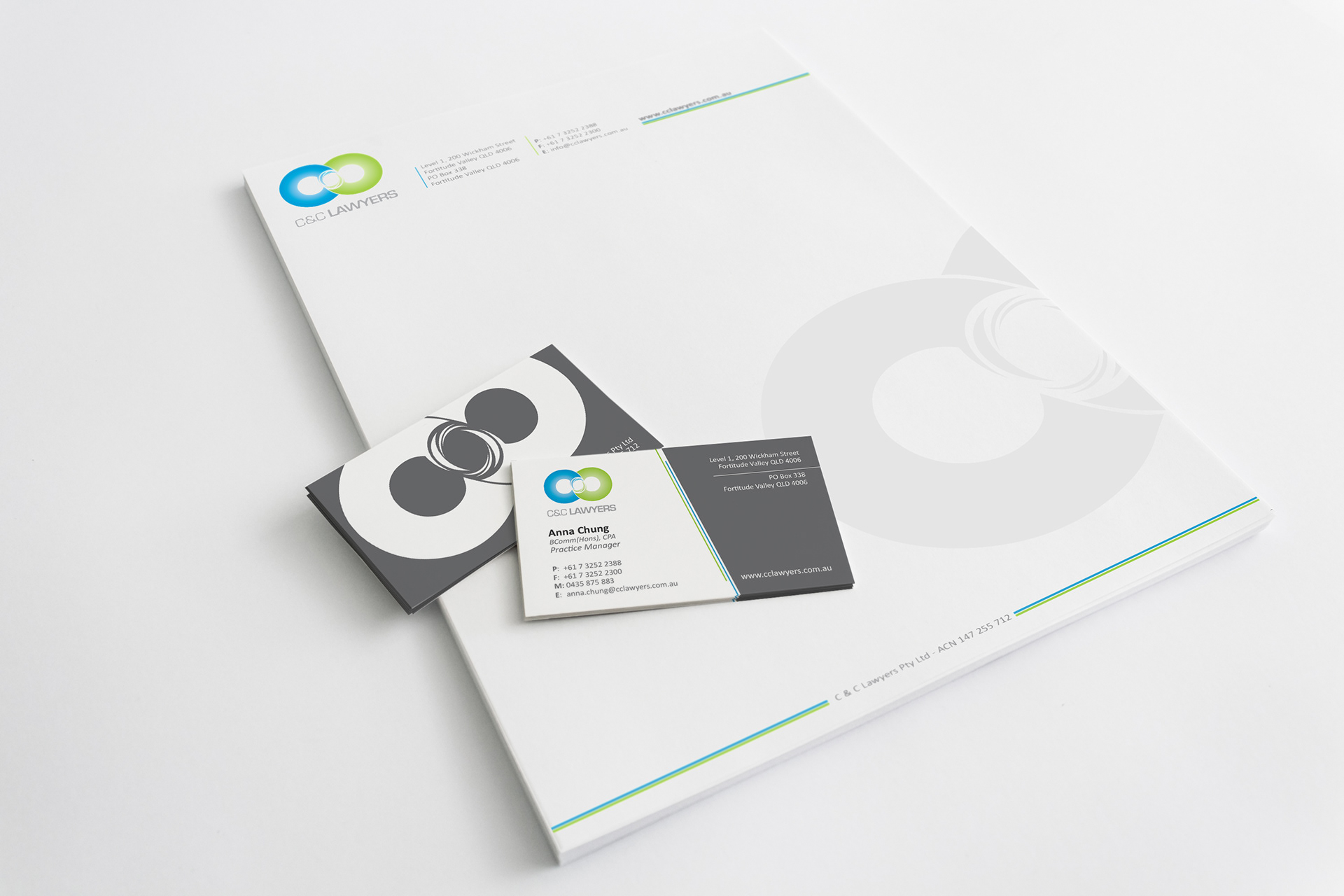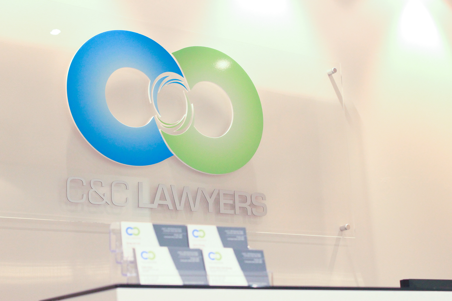 Corporate Identity & Logo design for C&C Lawyers. Design includes letterhead & business cards for all partners & staff, custom 3D raised CNC cut signage offset mounted for reception.
