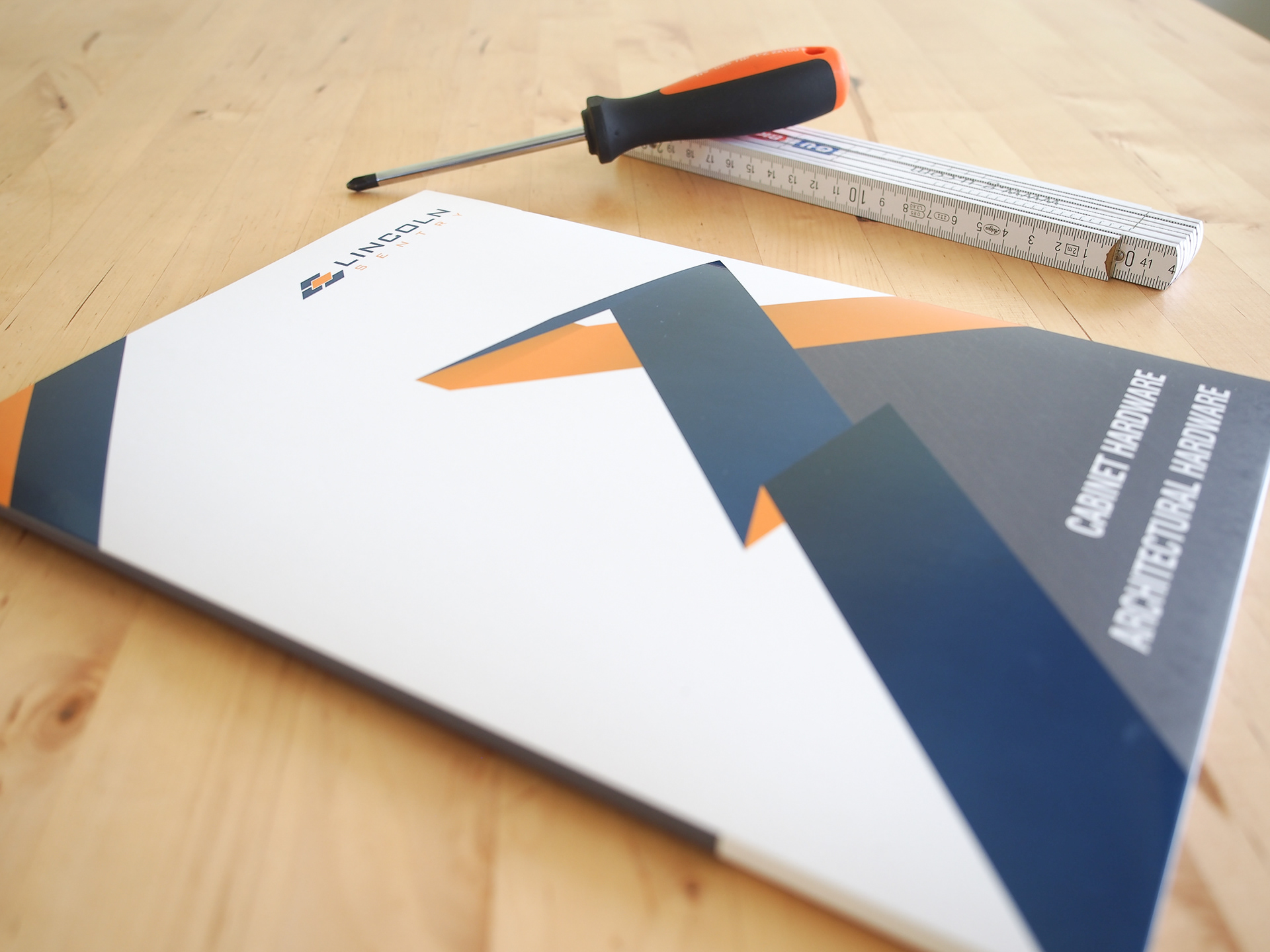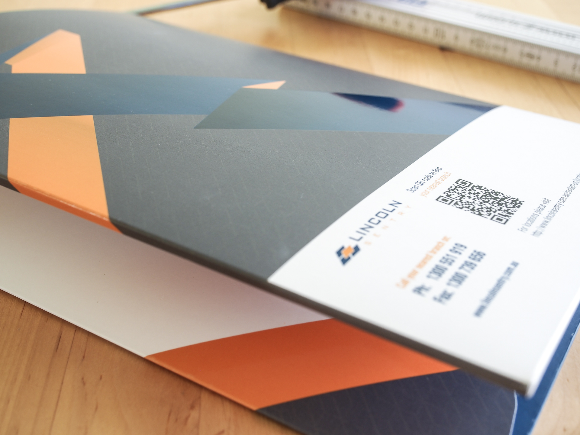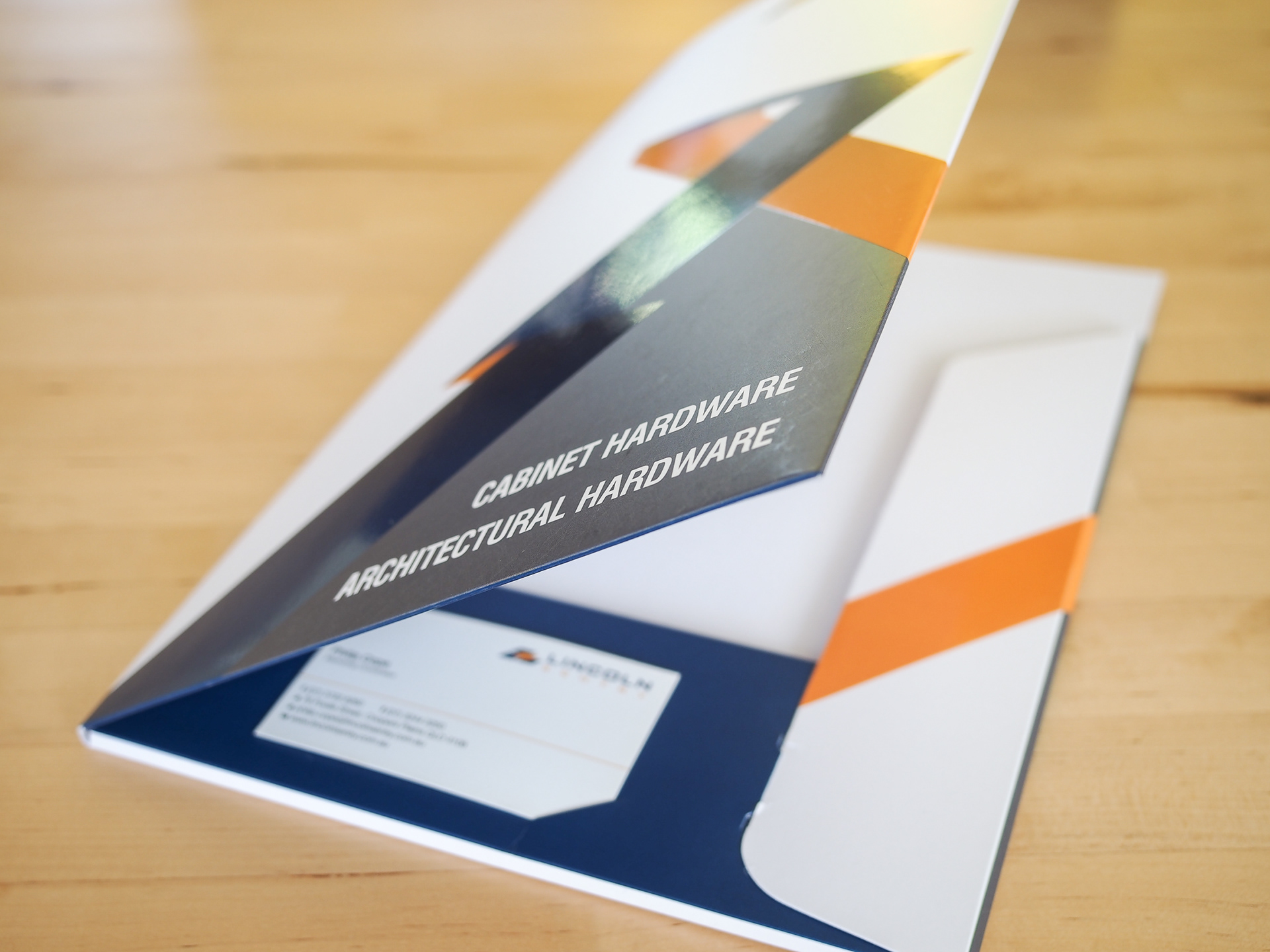 Die cut corporate presentation folders for Lincoln Sentry sale and specification representatives. Gusseted to store product brochures.