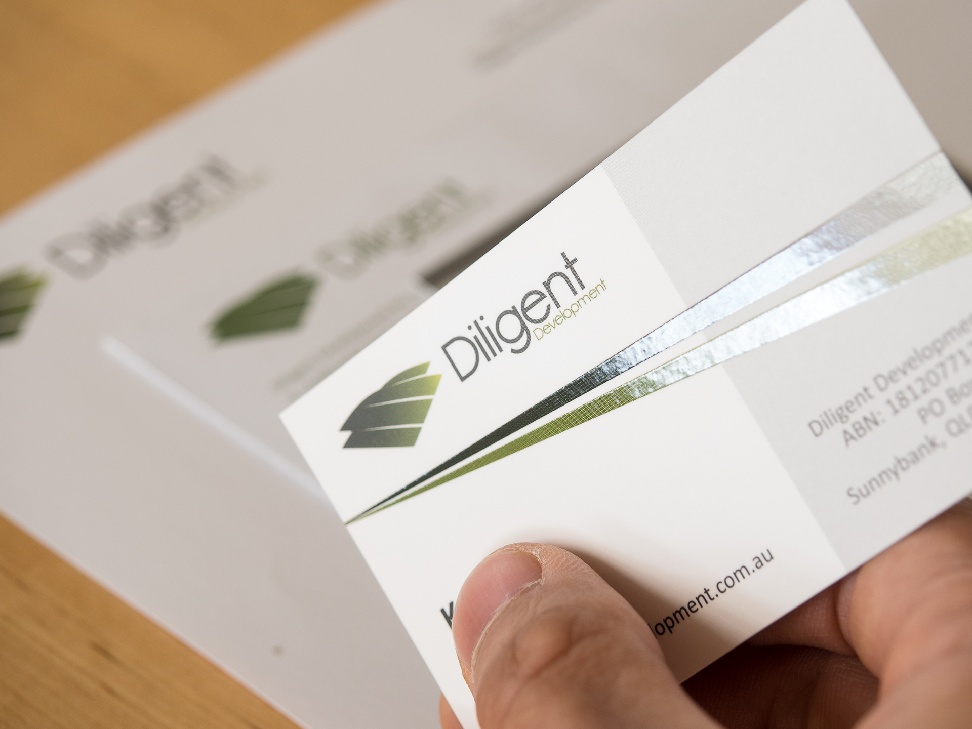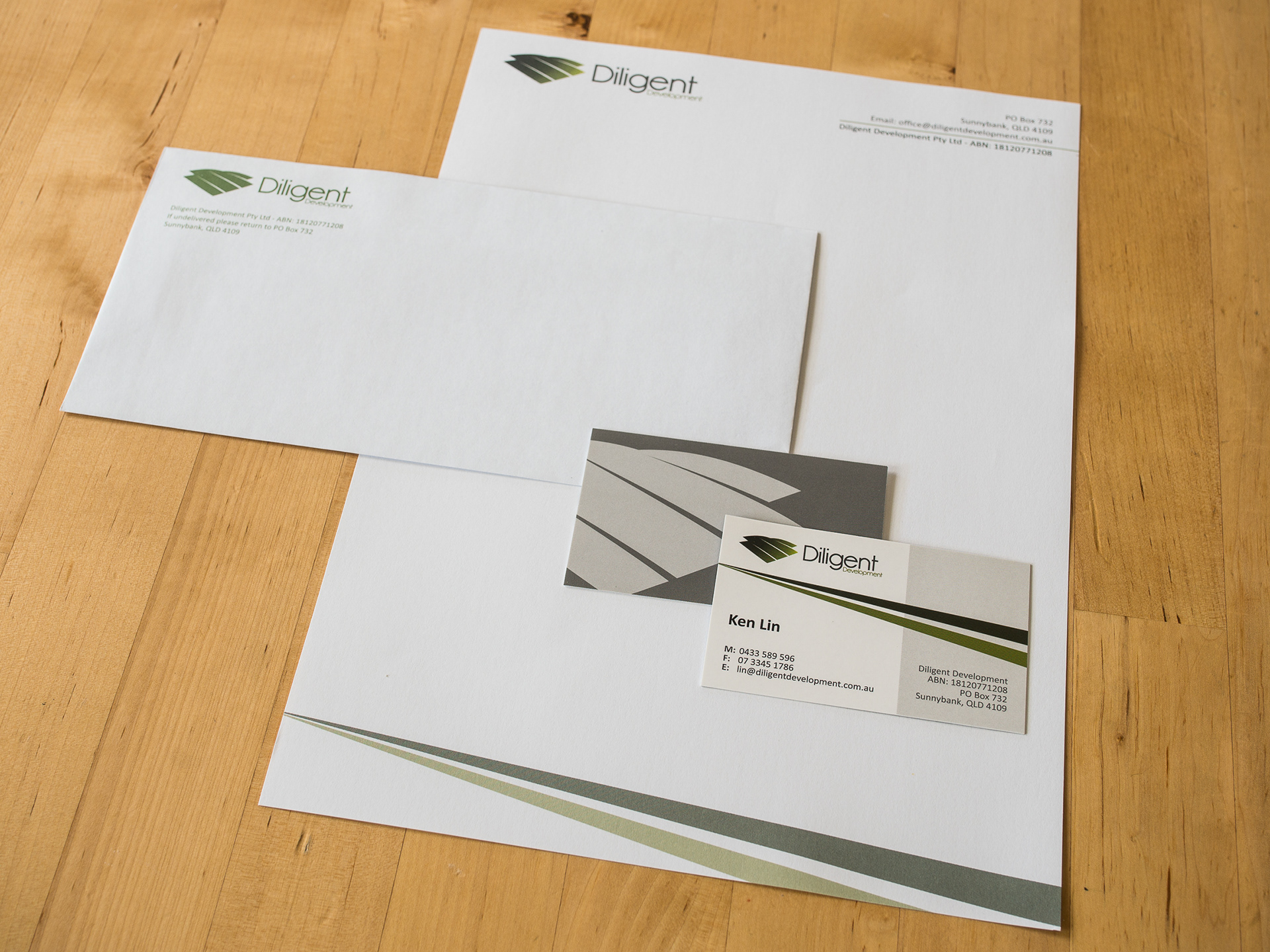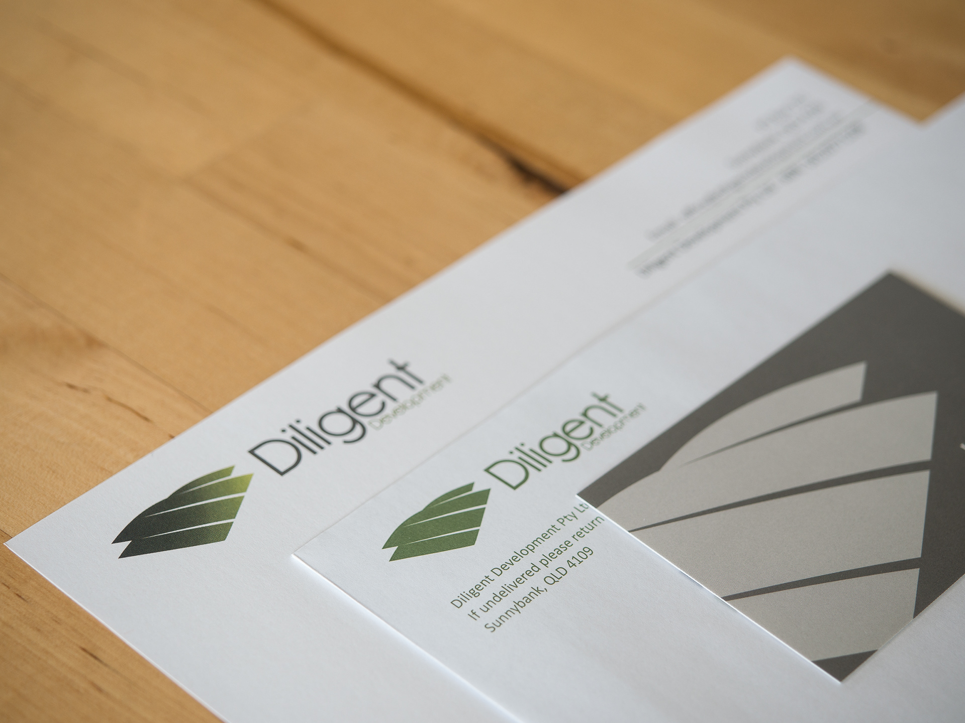 Corporate identity/ Logo creation for Diligent Development Stationary set including business cards, letterhead and envelope.
