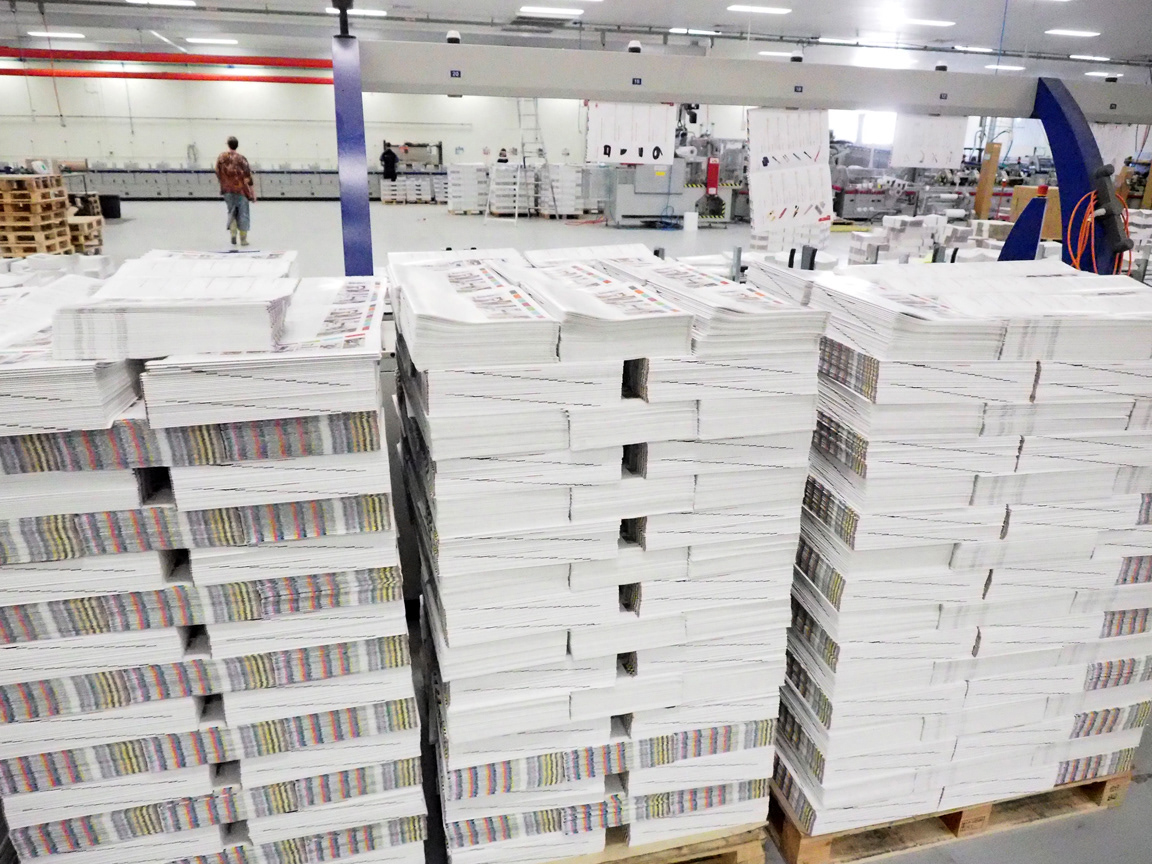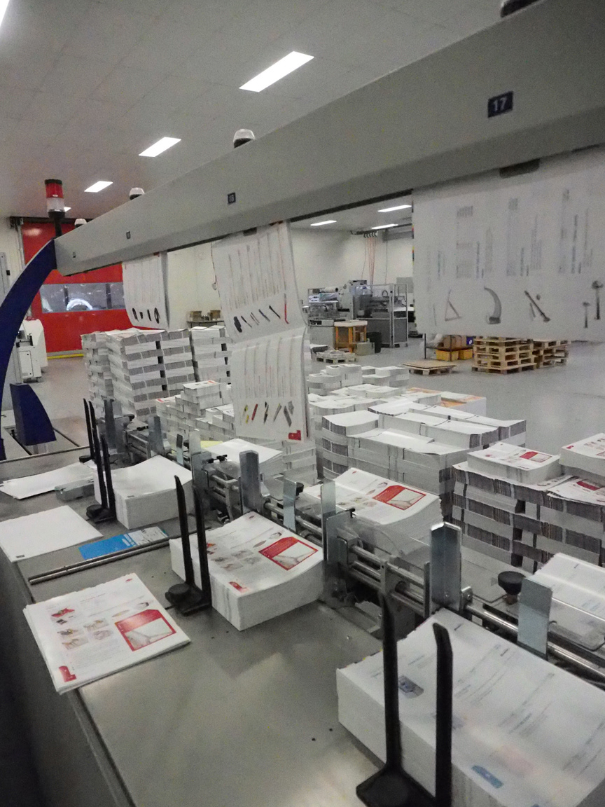 Sections of the 800+ pages being stitched, collated and sorted.